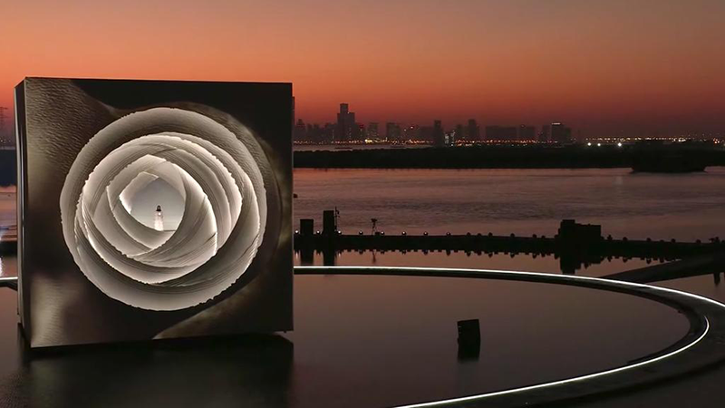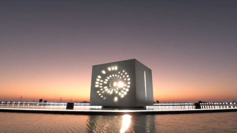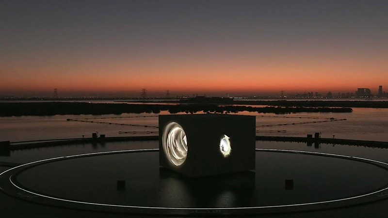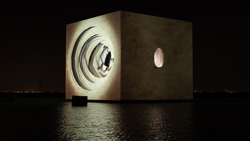 这个项目主体为一个巨大的旋转立方体雕塑,它被水包围着,立方体内部被装饰上窗帘和投影幕布,高质量的投影装置将一个动态光雕塑变成了一件身临其境的艺术品,视觉效果非常突出。