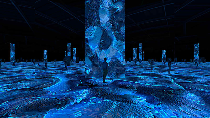 伴随着冲击波的声音,高清晰度的波浪在6米高的墙壁上下奔腾,以独特的视觉节奏点缀着漆黑的环境。