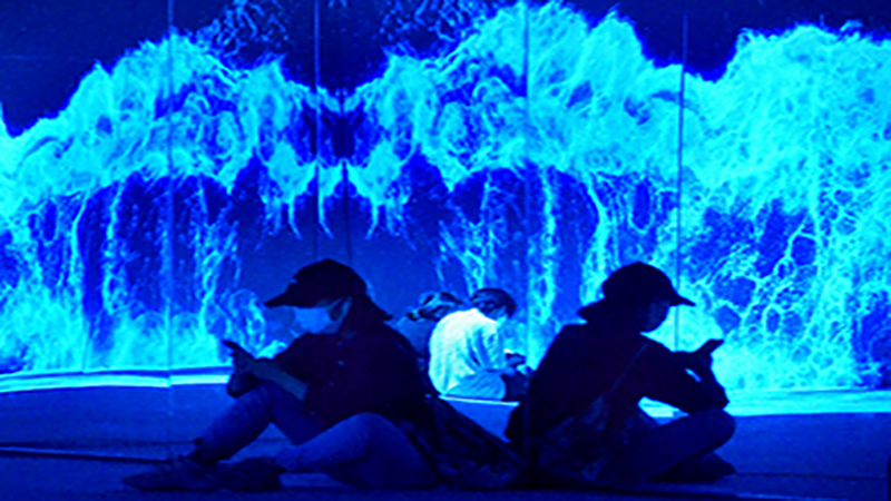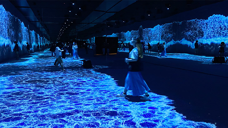 在白色和蓝色中,闪烁的波浪穿过漆黑的空间,这个空间被设计成一个星光灿烂的夜晚。投影以三分钟为一个周期进行循环播放,但是波浪的模式是交替的,所以游客不会觉得他们在一遍又一遍地看同一个视频。