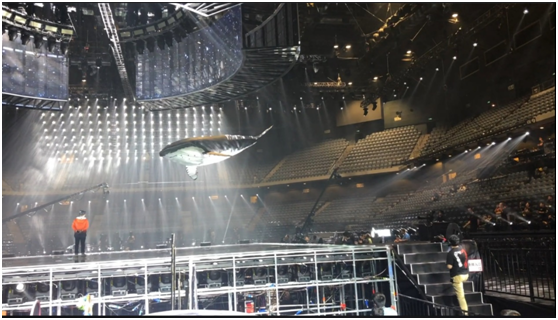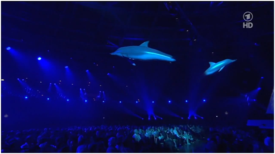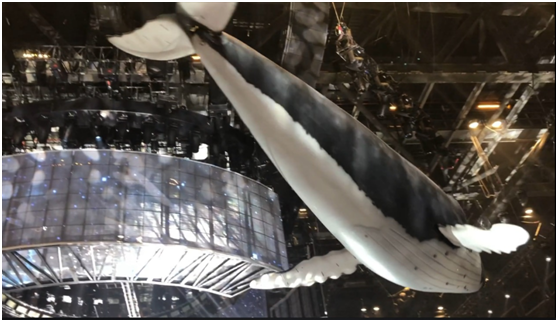 澳门金光综艺馆的JSTV制作的直播电视节目中,制作了一只带仿生尾鳍的无线电控制飞行鲸。
