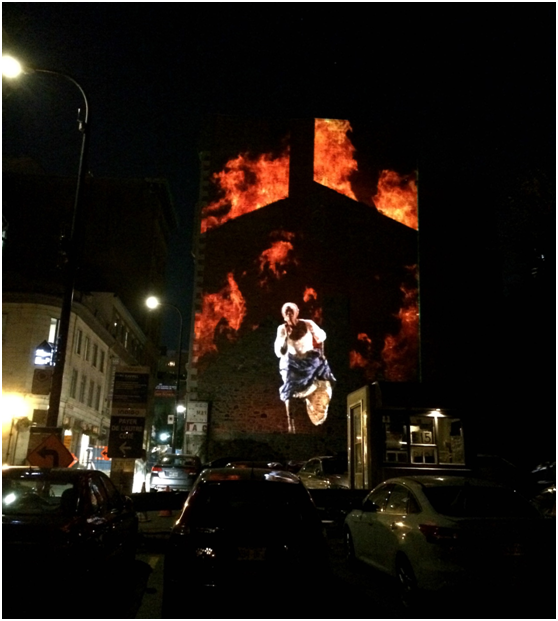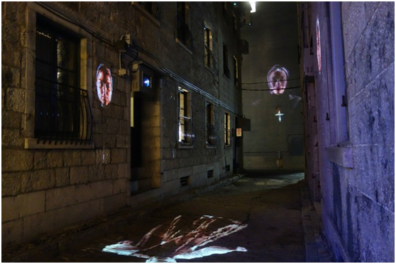 关于1849年焚烧议会的画面可以在尤维尔广场的旧消防站找到。投影使用了建筑上的一扇用墙围起来的窗户,营造出一对忧心忡忡的夫妇向外凝视的影像。你和他们一起看着抗议者聚集在街对面的大楼前,大楼被照亮成议会的样子。