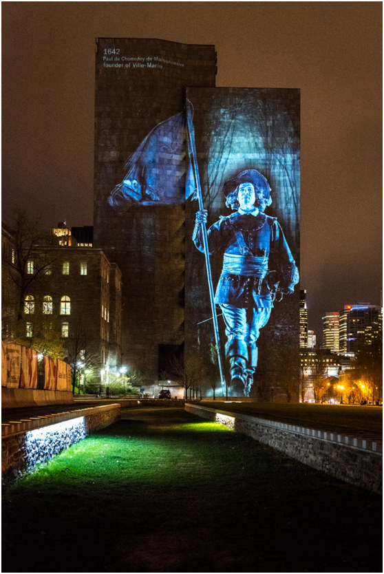 在四年里,老蒙特利尔的树木、建筑和鹅卵石街道将被一系列城市历史相关的投影影像照亮,这些影像与历史建筑相关联,每个装置的影像与历史建筑的结合颇具创意,游客可以发现、并开启若干的建筑投影装置,并像景点导览系统那样通过文字、音频等资讯感知城市的历史。