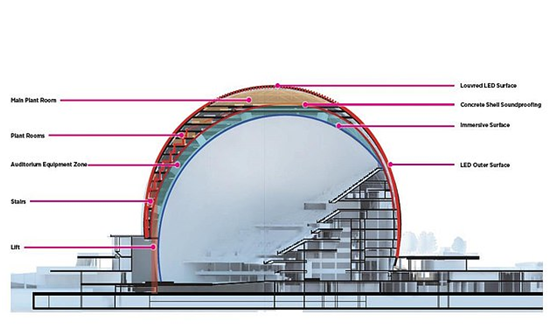 该项目是一个几乎全球形的场地,可容纳15000-20000人。Sphere的内部配备一个16K分辨率的环绕式LED屏幕,面积为160000平方英尺(15000平方米)。这将是世界上最大、分辨率最高的LED屏幕。场馆的外部将配备58万平方英尺(5.4万平方米)的可编程LED显示系统,可显示2.56亿种颜色。