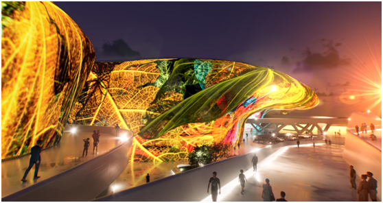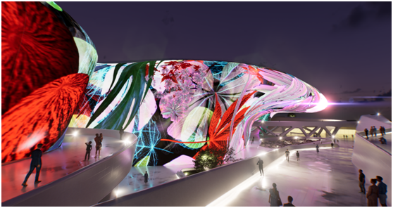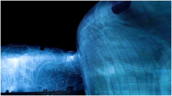米格尔•施瓦利埃“利用东大门设计广场外墙的222米超大型建筑曲线外墙为画布,通过投影3D MAPPING技术进行艺术内容展示,此次作品名为《Meta-Nature AI》。