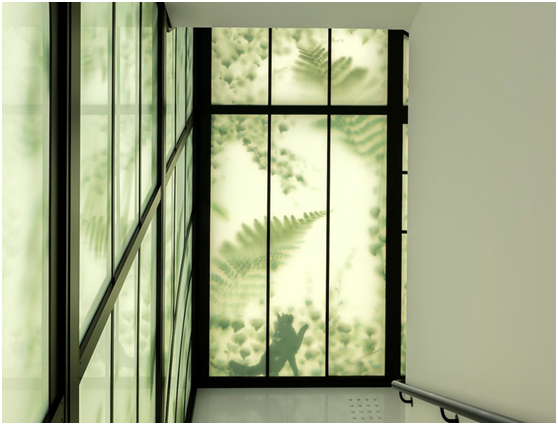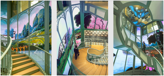 自然的四季更替在商店正面的高而圆的黑色拱门中展开——数字壁画按照自己的昼夜节律运行。白天这些数字壁画的玻璃是透明的,可以看到商店内的活动场景。到了晚上,这些立面被数字影像覆盖。