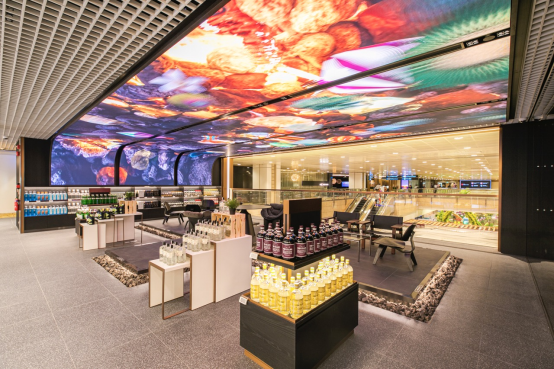 在新的零售和餐饮产品中,乐天免税葡萄酒和烈酒公司横跨两层楼,拥有一个机器人调酒师一个品酒休息室和一个30米长的LED环,让人想起湖面上反射的月亮。上层的李白森林是一个豪华的休息室。在这里,游客还可以使用智能自拍镜与著名K-pop艺术家合影。