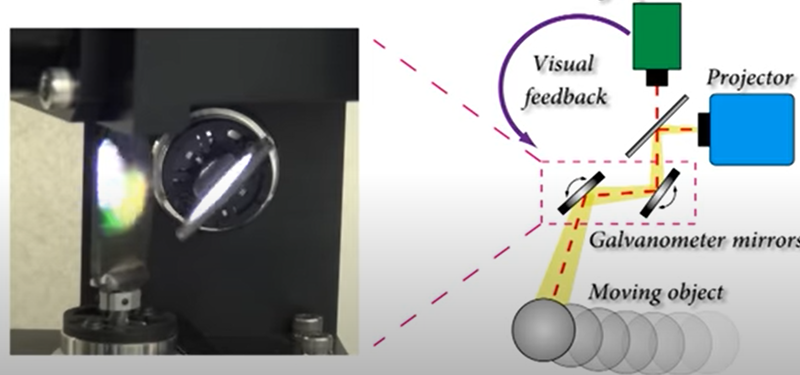 如上图所示,Lumipen是一种基于投影的MR系统,它由高速跟踪的机器视觉、投影仪和高速反射镜和作为背景的反射材料组成。当一个物体快速移动时,投影的内容会毫不延迟地跟随它,并且我们可以体验增强现实,而不会因为延迟而带来不适。关键技术: