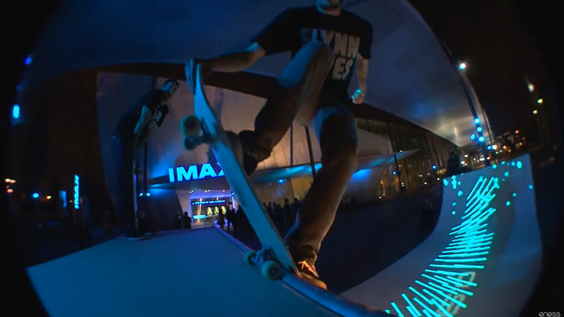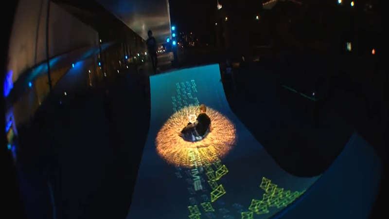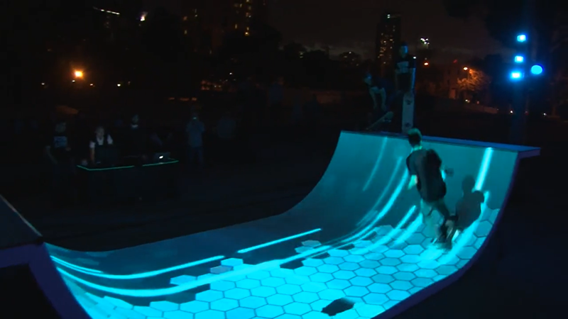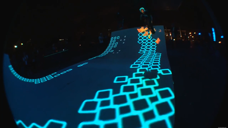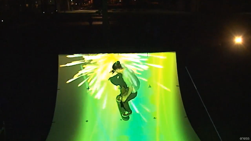 Light Session™滑板坡道为每个滑板爱好者装备了一个iPod,以及定制的APP。结合追踪摄像机和红外标记点,通过定位系统,mapping在坡道上的图像不仅可以追踪滑板爱好者的位置,并且会在滑板腾空或着陆时,触发mapping画面的变化。