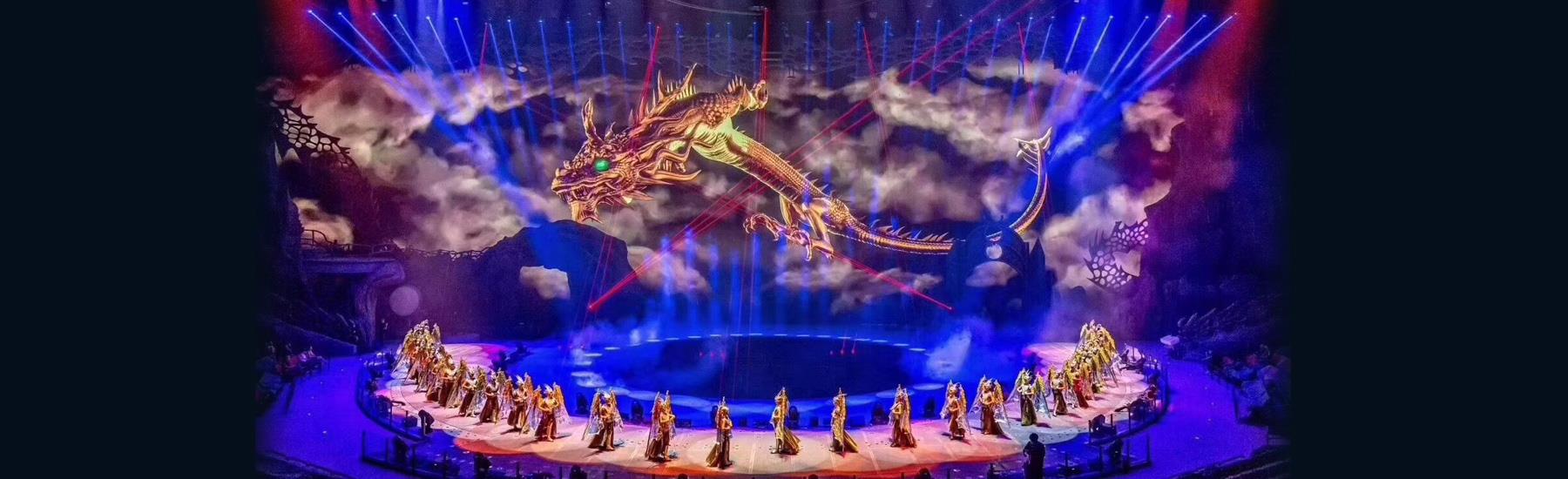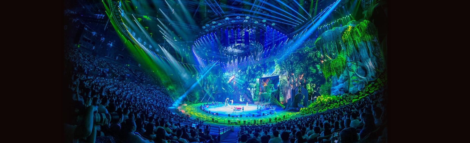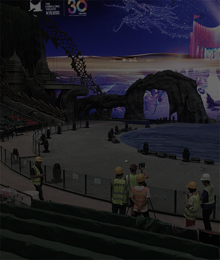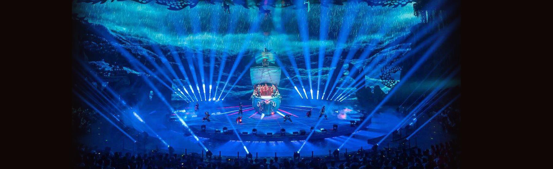 珠海长隆剧院总建筑面积达7.1万平方米,剧院把LED特效与高亮度投影系统有机结合,将极致的舞美、灯光、音响等元素重新定义整合,连接紧凑剧情氛围,大大加深了观众的沉浸感。270°全景式环形舞台和3大环绕水道、空中飞行轨道及隐藏式飞行器等大型演艺设备,以及水上花船、双层水帘、升降喷泉等水陆空效果随不同节目灵活变换,带来“上天入地下水”的不同演出效果。