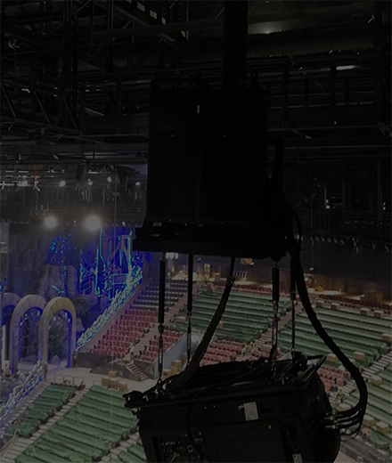 通过点云技术剧场建模,追踪摄像机和投影系统标定校准,借助水下光学标记点的使用,完成了灯光、投影机、舞台机械等声光电设备的集成。22台32000流明的barco激光光源投影机,配合1300平方米的LED大屏,为演出的剧情推进和氛围烘托起到了关键作用。